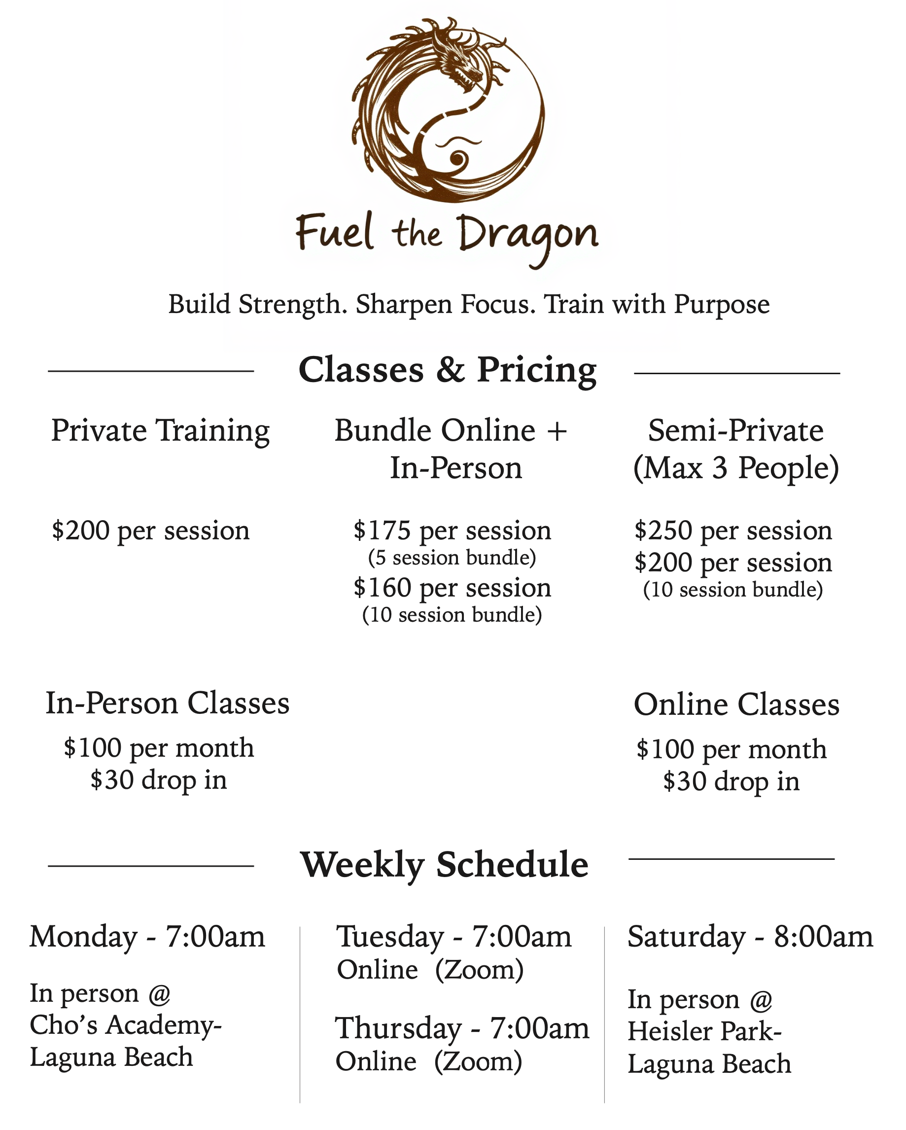 FuelTheDragon offers flexible training to fit every schedule and goal: private one-on-one coaching, small semi-private sessions, fully online programs, and in-person classes, all guided by Brian Olson’s intentional, thoughtful teaching approach that emphasizes technique, safety, and measurable progress. Join us in Laguna Beach at Cho’s Academy or scenic Heisler Park, or sign up for in-person sessions throughout the surrounding area. Newport Beach (including Corona del Mar), Costa Mesa, Laguna Woods, Laguna Hills, Aliso Viejo, Laguna Niguel, Dana Point, South Irvine, Lake Forest, and Mission Viejo.